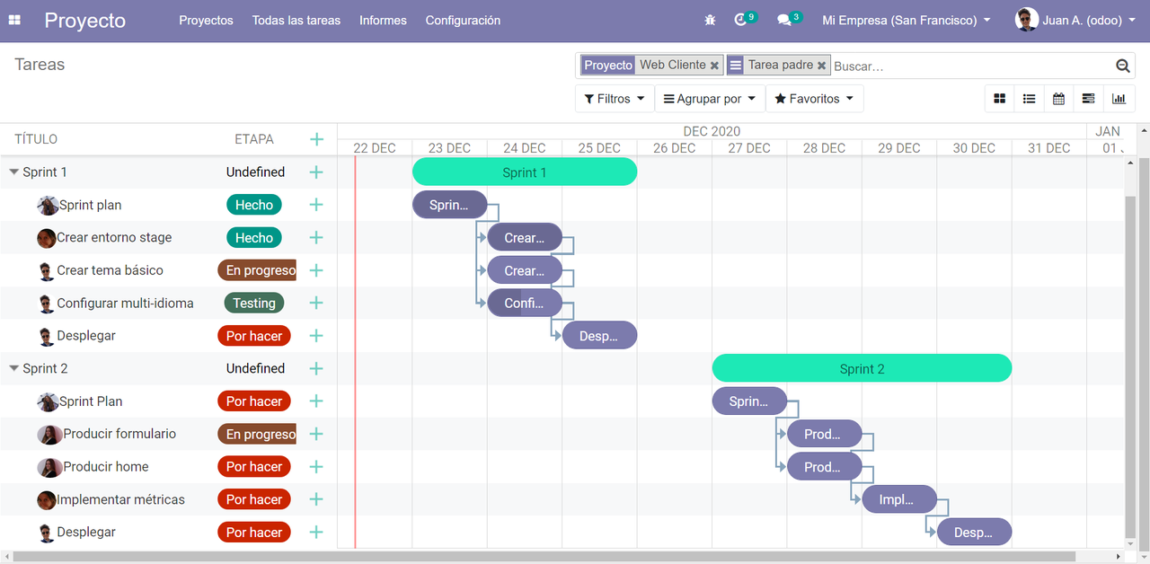 Utilizar herramientas de Odoo para la planificación y gestión de proyectos, lo que permite una coordinación eficiente de los recursos y el cumplimiento de los plazos de entrega.